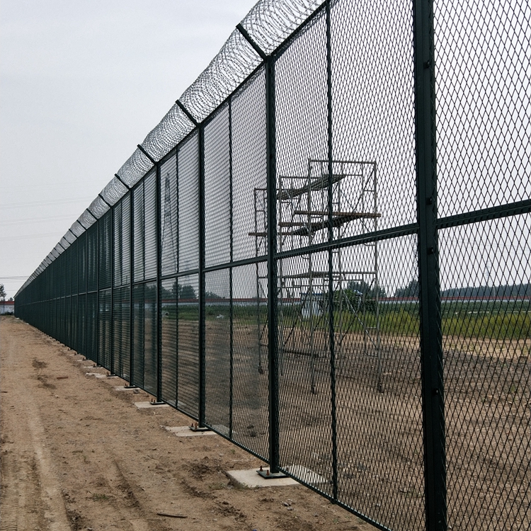 从结构组成来看,机场围界网主要分为四部分:一是基础结构,采用钢筋混凝土浇筑地基,深度不低于0.8米,部分软土地基需加深至1.2米,确保围界抗风载、抗撞击稳定性;二是网体主体,主流采用高强度镀锌钢丝或不锈钢丝焊接网片,网孔规格多为50mm×100mm或75mm×150mm,钢丝直径≥4mm,表面经浸塑或喷塑处理(颜色以草绿、深灰为主),兼具防腐蚀与隐蔽性;三是顶部防越设施,飞行区、油库等重点区域围界顶部,需加装0.5-0.8米高的刀片刺网,刀片刺网采用交叉螺旋式安装。四是辅助结构,围界每隔3-5米设置混凝土或钢管立柱,立柱与网体通过防盗螺栓连接,部分区域还会在围界底部加装防钻钢板,防止人员从底部挖洞入侵。