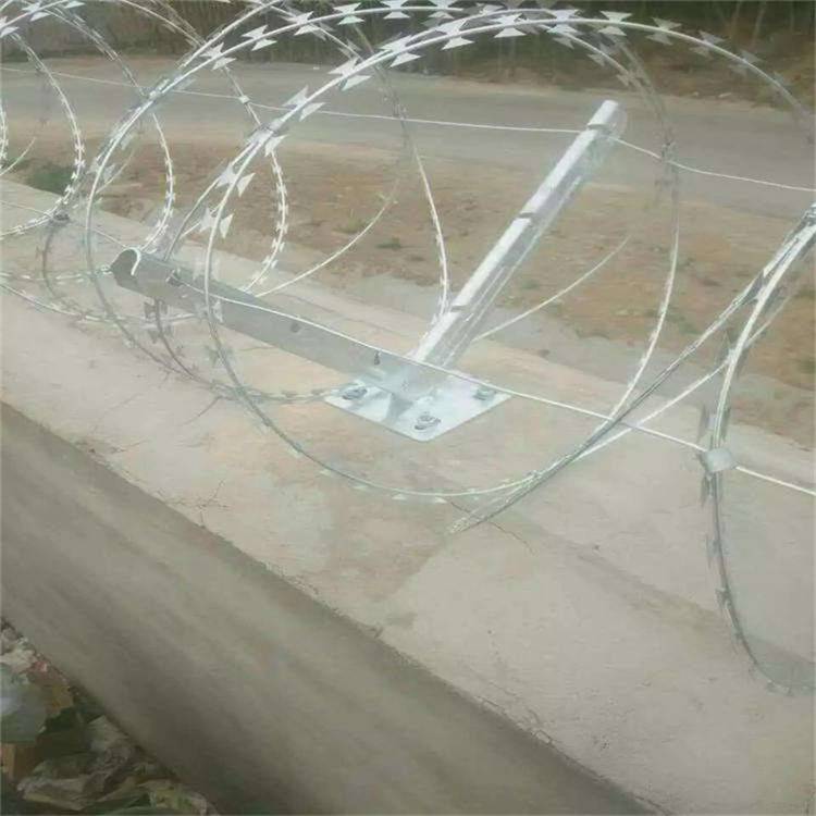 螺旋式刀刺网与护栏网片的固定通常采用专业的连接构件。常见方式为使用高强度的镀锌卡扣或防脱落的金属锚固件,沿护栏网片的横向支撑梁或纵向框架,按照预设的间距将刀刺网螺旋主体牢固锁紧。操作过程中需确保刀刺网展开均匀,每一圈之间的间距保持一致,从而形成连续的防护层。对于顶端带有支架的护栏网片,则通过将刀刺网架设于Y型或L型支架之上,再以专用夹具进行多点位固定,确保其受力均衡,不易发生位移或松脱。